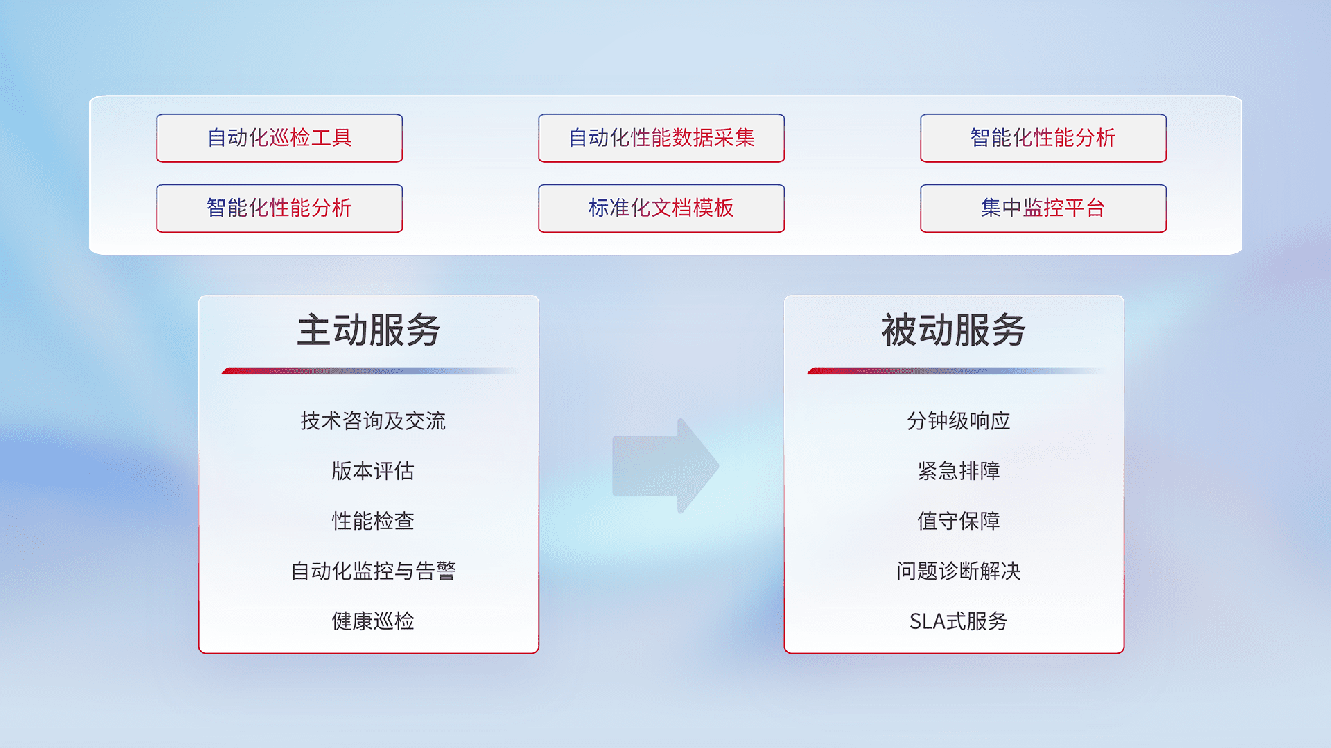 智能化工具和标准化文档,,,保障服务质量,,,提供主动服务(包含技术咨询、、、版本评估、、性能检查、、自动化监控与告警、、健康巡检)和被动服务包含(分钟级响应、、、紧急排障、、、、值守保障、、、、问题诊断解决、、、、SLA服务)。。